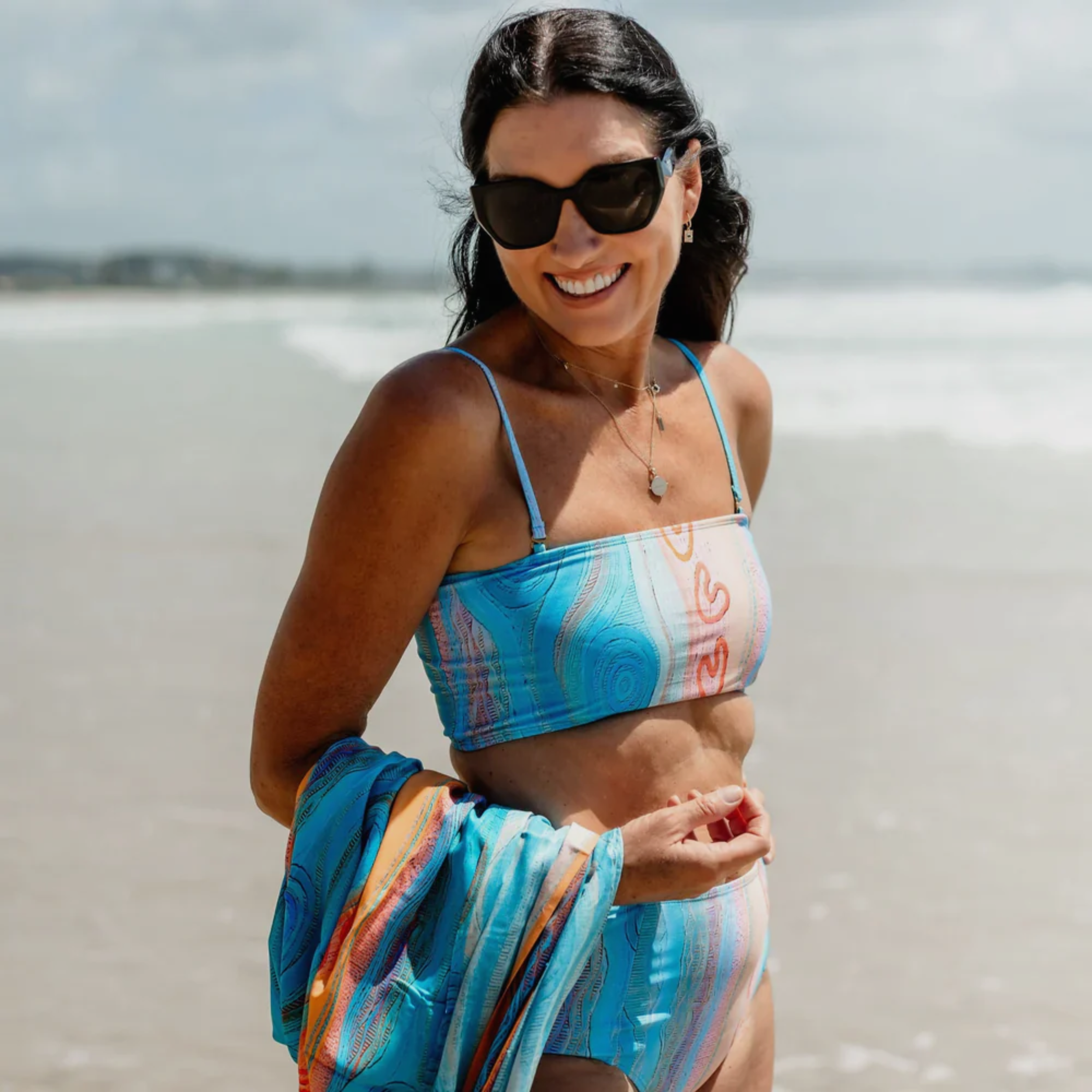 Love-love-love. My first high waisted bikini bottoms and very happy with how they fit around my waist, bottom and bikini line. Perfect coverage, not cheeky for those of us who might prefer not to wear something cheeky on family beach days. Again, the print (artwork) is bright, cheerful and one of a kind!